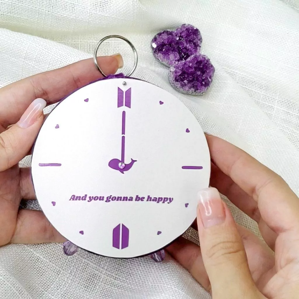 A baleia, que entrou na história do BTS como um símbolo de solidão, hoje representa união. O BTS tem os Armys e os Armys tem o BTS, um relacionamento sincero de entrega mútua. Então, usei o símbolo da baleia roxa pra te lembrar que você nunca estará só. E sim, apesar de toda dificuldade do dia a dia, um novo dia virá e você pode ser feliz!