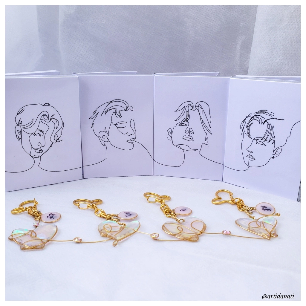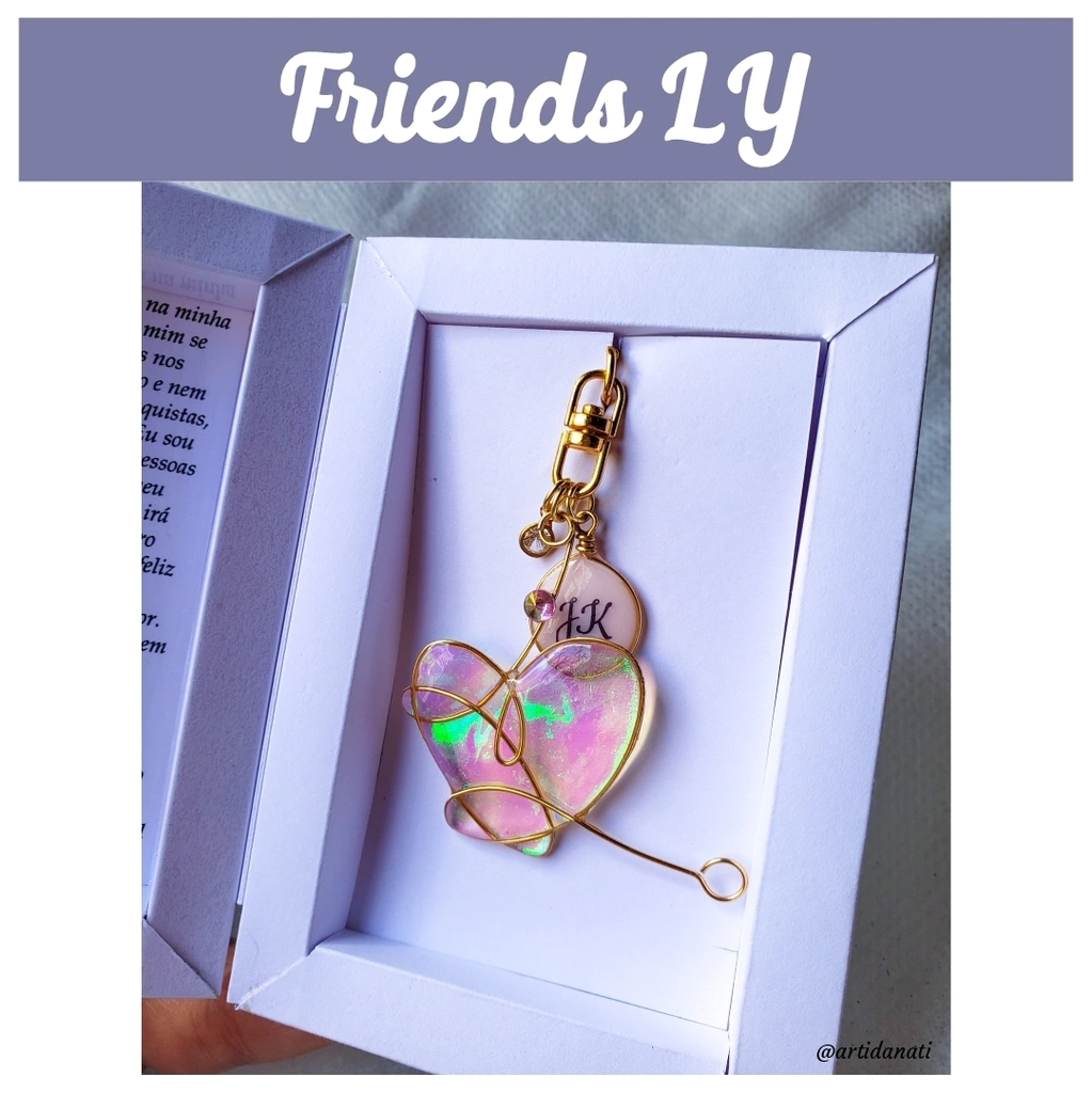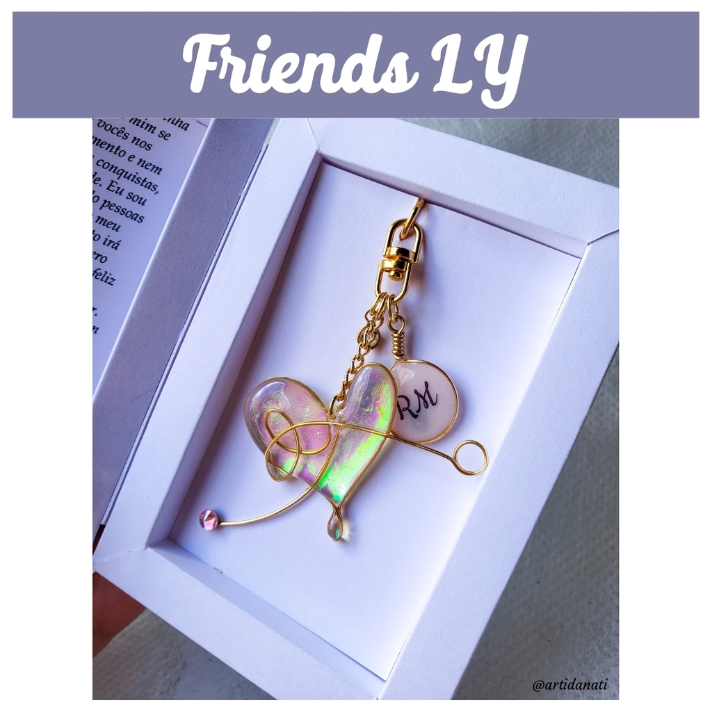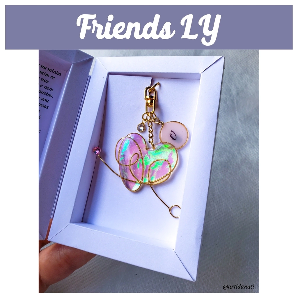 Chaveiro moldado em fio de alumínio dourado e preenchido com resina. Possui efeito furta-cor ao fundo. Cada chaveiro acompanha uma embalagem com o desenho do seu utt.