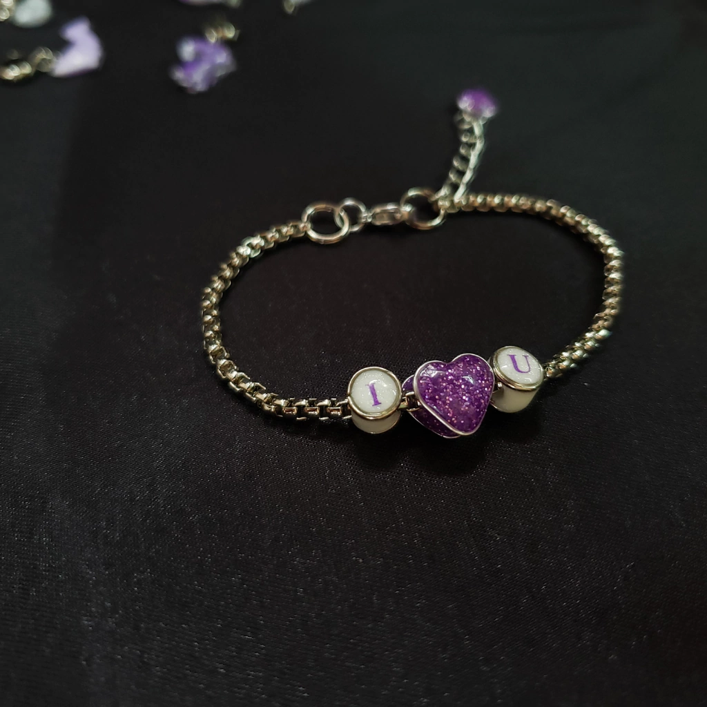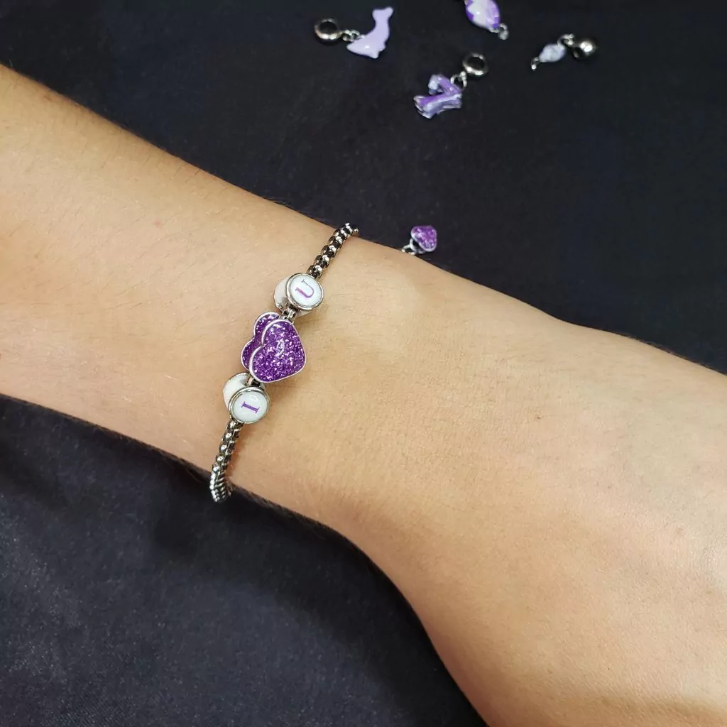Seu tamanho é ajustável e seu fecho possui argola tipo mola que pode ser retirada caso queira adicionar mais berloques. Ela acompanha apenas os 3 berloques que costam na imagem (o das letras e o do coração), demais berloques devem ser adquidos separadamente.